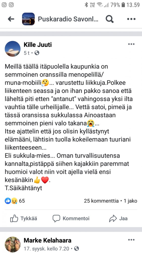Joo ei kannattaisi lukea mitään Facebook viestejä.Ihminen on vaan utelias. Toiset huomaa toiset ei oli pimeää tai valoisaa.Missä katseet luuraa? Heijastin pintaa on edessä ja takana ja valoja etenkin takana tuleville mielestäni riittävästi. DF:n omat pienet kirkkaat ledit ja hämärän hiipuessa laitan...