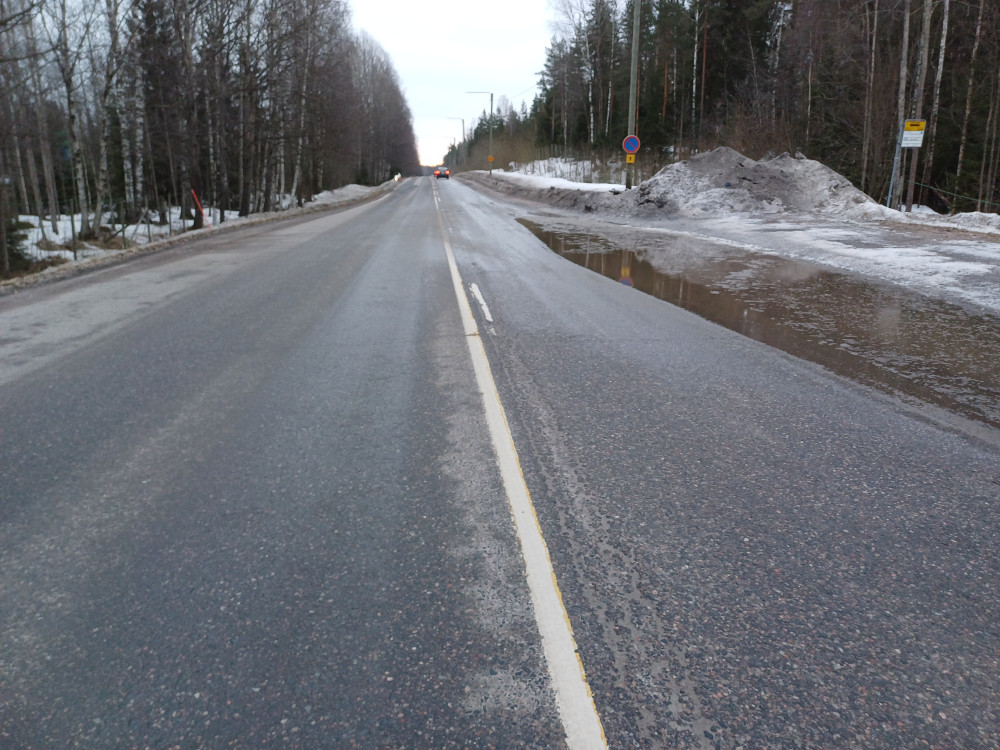 Syylliseksi paljastuikin sitten heti iso sulamisvesilätäkkö, josta autot ajaessaan olivat vettä sen ympäristöönkin roiskuttaneet. Kohta oli ihan kengän allakin hyvin liukas, lisäksi tiessä oli kohdalla selvä keskiharjanne ja kaista siis kohtuullisen kalteva, eli ei mikään ihme lopulta että kävi miten kävi.
