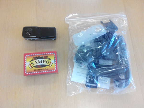 Nyt sain tuon MD80:n postilaatikkoon. Kiinalaiseen tyyliin paketista ei löytynyt mitään pakkausta, vain kamera ja sen "oheistarvikkeet". Tulitikkolaatikko kuvassa antamassa mittakaavaa: