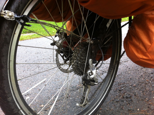 No Forssaan ei ollut pitkä matka, ei muuta kuin luuri käteen ja majapaikan varaus. Ilta oli jo sen verran pitkällä, että pyöräkorjaamot olivat menneet kiinni. Mutta ehkä huomenna riittävän pitkä vaijeri löytyisi. Nyt ei muuta kuin vaijerin jämät kiinni lokasujan pidikkeisiin, takavaihtaja keskirattaan kohdalle.