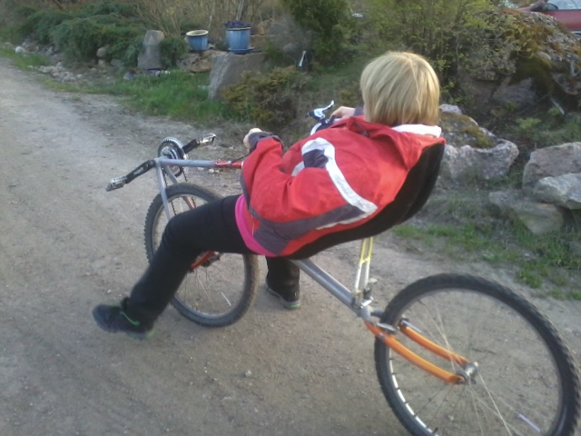 Vaimo ottaa tuntumaa MBBpyörään - mäenlasku harjoituksia. Ei toivottomalta näyttäny kun ottaa huomipoon viel ett ei oo hänen mitoilla.