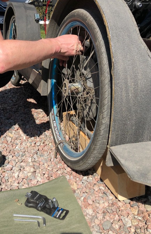 Ei ole 1CV:n huollettavuus järin hyvä, kun pitäisi takapyörä päästä irrottamaan: ensin korin irrotus, sitten sisälokarin aukirepiminen, jarrusatulan irrotus hankalasti kiekon läpi (pinnojen välistä), jonka jälkeen kiekon saa irti. No 1CV:n seuraavaan kehitysversioon sitten fiksummat rakenteet tältäkin osin.