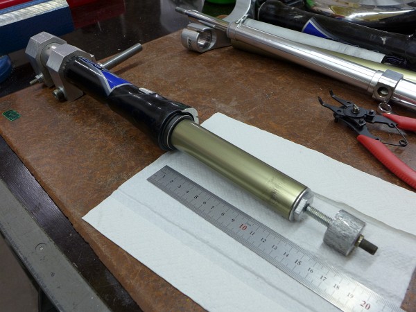 Aihioksi valittu haarukka teettää ylimääräistä työtä myös sisukalujen puolesta, nykyään kun molemmissa putkissa ei ole sisällä enää identtisiä kilkkeitä. Tuossakin oli nestevaimennuspatruuna vain toisessa putkessa. Onneksi ilmajousi on sentään molemmissa, sekään ei ole enää itsestäänselvyys uudemmissa haarukoissa.