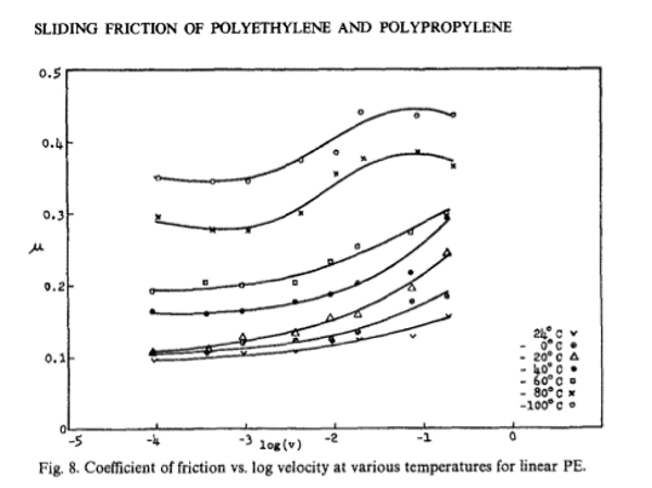 Kuvassa näkyy vain tyypillinen tuon tyyppisten materiaalien epälineaarinen käyttäytyminen lämpötilan ja liukunopeuden funktiona. Käppyrät ovat teflonille, jotta perustelisit väitteesi niin tarvisimme myös vastaavan datan vaihtoehtoisille materiaaleille, vai mitä?