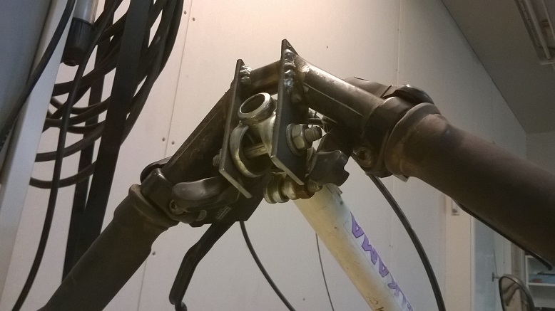 Orkkistangon paikalla on putkiholkki, jossa prikat hitsattu päihin pultin keskitystä varten. Tuon kun kiristää, niin lattaraudan reunat vähän hankaa stemmiin... pientä välystä pultissa on jos oikein voimalla kääntelee. Ja siinä on vielä viimeistelemättömät reunat, eli hieman vielä pyöristän niitä. Mutta varmaan siihen polvensa lyö kun oikein kääntää...aika näyttää. Vielä pitää keksiä joku kumi/muovi mitä vasten tanko makaa ajoasennossa (stemmin ja valkoisen putken kosketuskohta). Tai sitten hitsata pultti tms. stoppariksi/säätämiseksi...ajatustyö on meneillään...
