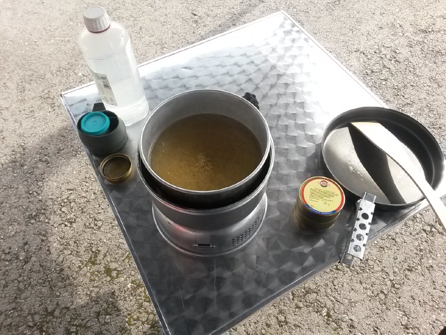 Tänään lounaaksi quinoapuuroa ja nötköttiä. Trangian edellisestä käytöstä on vierähtänyt vuosia. Polttonestepullossa oli hintalappu 22mk ![]()