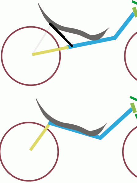 Tämä palautui mieleen kun funtsailin miten Jiven takapäähän saisi enemmän joustavuutta. Nythän tilanne on se että penkin tukiputket johtaa tärinän suoraan selkään ja niskaan. Voisiko tilanne korjaantua oleellisesti jos tukiputket korvaisi yhdellä paksummalla joka lähtisi rungon ja haarukan liitoskohdasta? Tuki lisätty mustalla pastorin kuvaan. Äkkiä ajatellen haarukkaputket joustaa enemmän mitä vaakasuoremmassa ovat. Varsinaista jousitusta en haluaisi nyt laittaa. Penkin ja takatuen väliin voisi kokeilla kumityynyjä, jos tukien muutos ei auta.