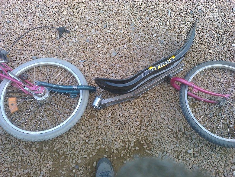 Meni suoraan hyvin mutta käännökset oli vaikeampia. Penkki on vähän liian korkealla kun saa vain sormenpäät maahan, mutta korjaantuu varmaan kun laitan 507 vanteen alle. Lasikuitupenkki ei oikein anna riittävää tukea yläselälle tasapainoilua varten tai sitte joustaa jostain muualta. Ainakin tuo poikki mennyt kohta on aika kriittinen. 25x1,5 neliöputkea. Ehkä siihen vois tehdä tukivarret penkin tuentaa kohti :?