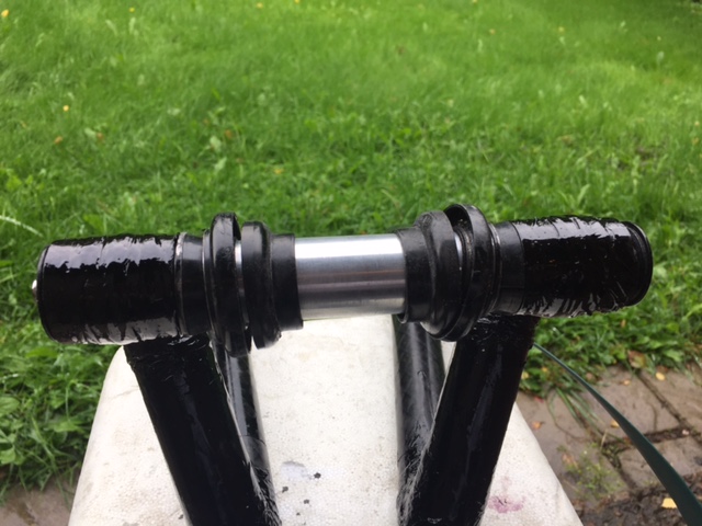 Keskiön suhteen en löytänyt oikein mistään putkea minkä sisään keskiölaakeri tulee. Tosi nyt kuitenkin sellainen liian myöhään löytyi ebaystä (bottom bracket shell). Meillä on yhdellä perheenjäsenellä takapihalla käytännössä käyttämätön ja rapistunut alumiinirunkoinen pyörä. Kävin sahaamassa siitä keskiön pois ja laitoin päälle likaisen muovikassin. Moraalisena perusteena oli ao henkilön minusta perusteettoman nurjamielinen suhtautuminen nojapyöräilyyn. Voi olla että jään kiinni ja on ulkoruokinnan uhka. Korvaisiko vakuutus runkokeskiön varkauden ? Keskiössä oli noin 50 mm ovaalimaista putkea mikä oli nopea viilata 50 mm putken sisään sopivaksi.