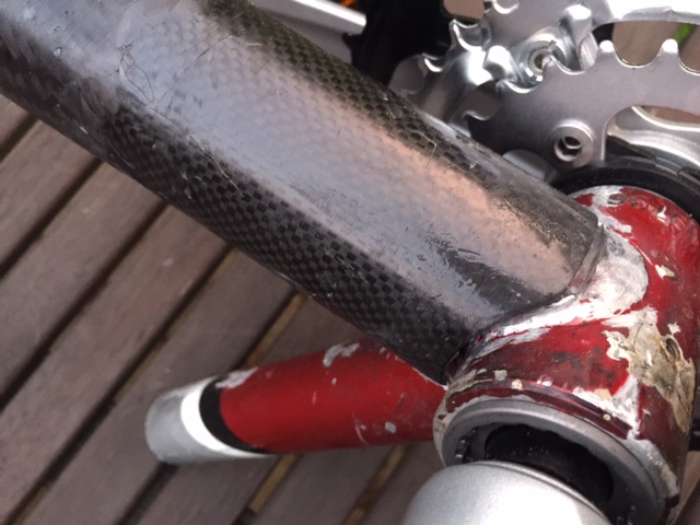 -pyöritä liitokseen ensi 3 krs 2-3 cm leveää hiilarinauhaa, UD jos on, epoksia niin että on varmasti läpimärkä.