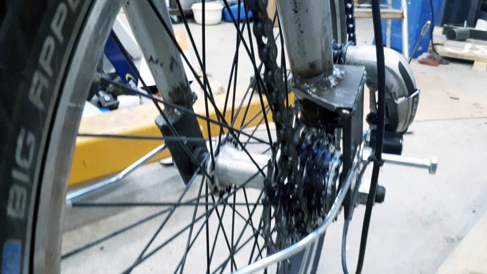 Ja sit osui silmään haarukkaputkien kiinnitys droppariin.. Laittaisin putket mieluummin suoraan toisiinsa kiinni, enkä ohuon levyn välityksellä. Niin raketeesta tulisi huomattavasti vääntöjäykempi..