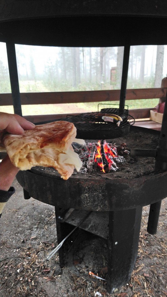 Sumuja siis seurasin, ensin saapumista ja sitten loittonemista. On se mielenkiintoisempaa kun ruohonkasvun katsominen :) Rauhoittavaa... Välissä tosin ehdin hieman rannalla käppäillä ja syödä aamupalaa. Laitoin tulet ja etsiskelin evästä, kuvittelin yhden täyden makkarapaketin pakanneeni ja sitä ajattelin aamupalaksi mutta vissiin Sailan matkaan kumminkin työnsin kun ei pyörästäkään löytynyt. Kaupasta onneksi olin ostanut pari rieskaa ja ne lämmitin nuotiolla sormia polttavaksi, väliin pikkelssiä ja juuston sukulaista, oli muuten hyvää. Jälkiruuaksi banaani, uskotteko muuten jos sanon, että väliin laitoin Fatzerin sinistä? No ette niin tässä kuva :)