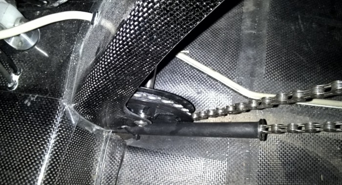Kun kerran oli luukut auki, niin sain myös vihdoin putsattua ketjusta inhottavat tehtaan rasvat pois. Samalla oli hyvä tilaisuus ottaa voimalinjan lyhyt ketjuputki pois, se kun oli kiusannut minua alusta asti. Laitoin tunnelin pohjalle hieman tarranauhaa pehmusteeksi, mutta taitaa olla turha. Pieni testikierros ja koko voimalinja hiljeni huomattavasti!! Nyt oli vaarana lattialla olevien tavaroiden imeytyminen ketjun mukana, joten eikun hommiin askartelemaan suojalevyä. Kun ketju oli pudonnut taaimmaiselta rissalta, olin polkaissut sen ketjuputken ja hiilikuidun läpi, joten sen voisi korjata samalla vaivalla. Tuota rikki mennyttä nokkaa ei tarvita kuin ketjuputken kiinnittämiseen, joten olisin toisaalta voinut leikata nokan myös kokonaan pois.