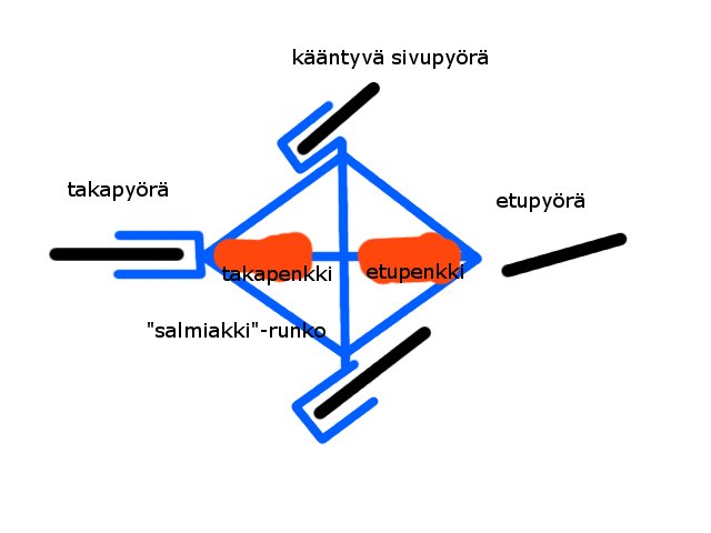 Tuo nelipyöräisyys on aika vinkee. Kehittelin ideaa ja ajatukseen synty sellainen idea. Mitä jos laittaisin takimaisen polkemaan ,niinkuin janus . Tämän takimaisen polkian runko osuus olisi irotettavissa , vähän saman tapaan kuin auton peräkärry .