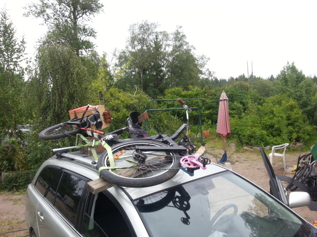 Sekin kävi mielessä, että olisin lähtenyt huoltoautoksi omalla autolla, mutta auton vieminen yli oli mielestäni turhan hinnakasta vain sen takia. Ehkä siihen olisi kolehti saatu, mutta näin nyt tällä kertaa. Ja Corollan takakonttiin saa vain 160x100cm tilan.
