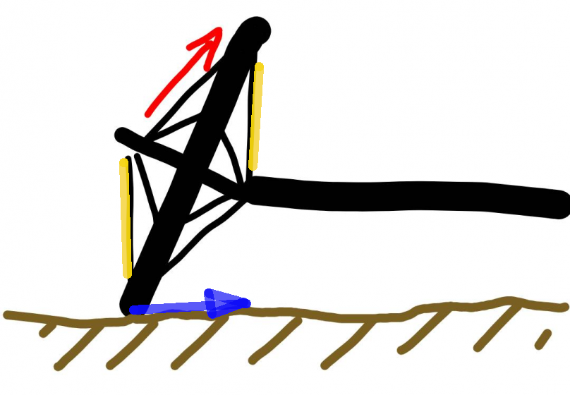 Kun kaarretta jyrkennetään, keskipakovoimaa (harmaa) vastustava keskihakuvoima (vaakasuora sininen) kasvaa (punainen osuus), jolloin punainen osa vaakasuorasta voimasta muodostaa akselin kanssa voimaparin ja siis momentin, joka pitää ottaa vastaan keltaisten pinnojen lisäjännityksellä.