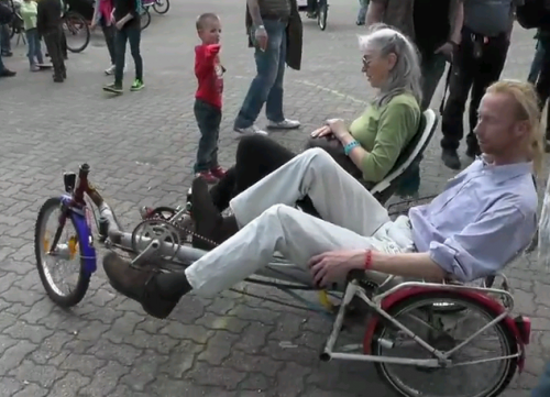 Tuossa videossa, kohdassa 5.45 tandemversio, vähän saman sukusesta pyörästä. Ykspuoleisella vedolla, ja yksi kampi lisää oikealla - ni Syrjiksestäkin sais helpost tandemin. muok. videon pyörässä olikin erilliset kammet.