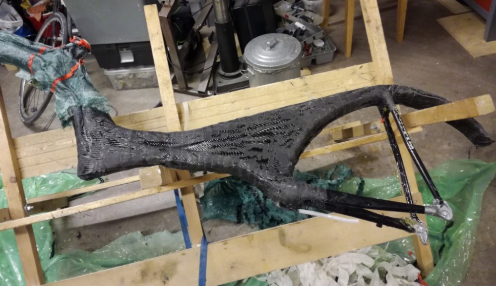 Yli yön uunissa ja karkki ulos. Ei näyttänyt hyvältä, mutta lienee pelastettavissa. Vaijereidenvientiputkien kohdalta vakuumi oli painanut urat vaahtoon..... onneksi oli suora, jos emäputki on kohdallaan vielä niin täyttö+ lisähiilarikerros pelastaa.