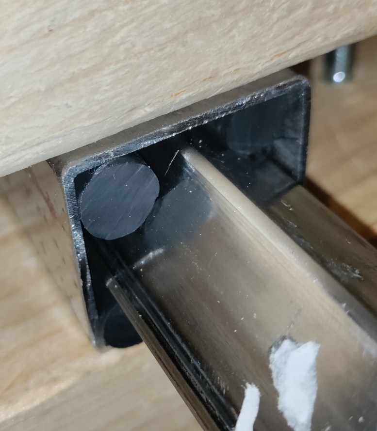 Ulompi putki 40x40x1,5mm, sisempi 25x25x1,5mm ja välissä pressun tikaskuminauhasta leikattua tankoa. Putket sopivat mukavasti sisäkkäin, mutta kumitanko on liian ohutta. En tosiaan ole löytänyt paksumpaa. Pitää kokeilla itse valaa silikonista, sikaflexistä tms