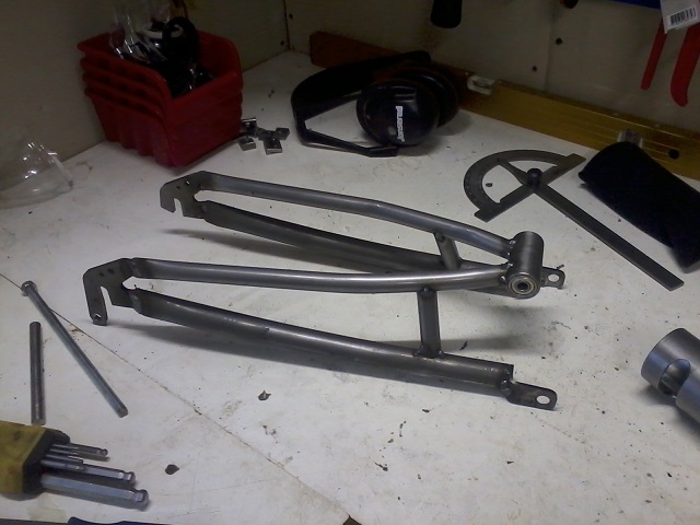 Takahaarukan ja keinunivelen "yhdyslattojen" väliin hitsaan putken joka jäykistää tuon tsydeemin. Ja joo se kytkentä on molemmista päistä laakeroitu, yleensä noi takahaarukat on tosin pultattu suoraan linkkuun.. jotain hienoa pientä regressiivisyyttä ja herkkyyttä mä sillä hain, katotaan toimiiko yhtään niinkun pitää