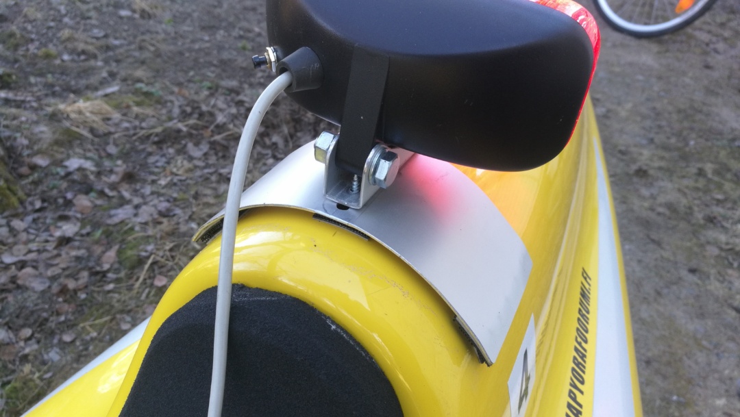 Korjasin vähän valokiinnikettä kun pojan ajaessa, huomasin valon vähän heiluvan. Porasin löysät popniitit pois ja ruuvasin alumiinikappaleet ruuveilla toisiinsa - saattaahan tuo ajan kanssa löystyä tärinästä, jotain liimaa ois voinu laittaa väliin mutt ei ollu käsillä. Kaareva kappale on tarranauhan kappaleilla kinnerin nystyrässä kiinni, ne tuntuu pitävän.
