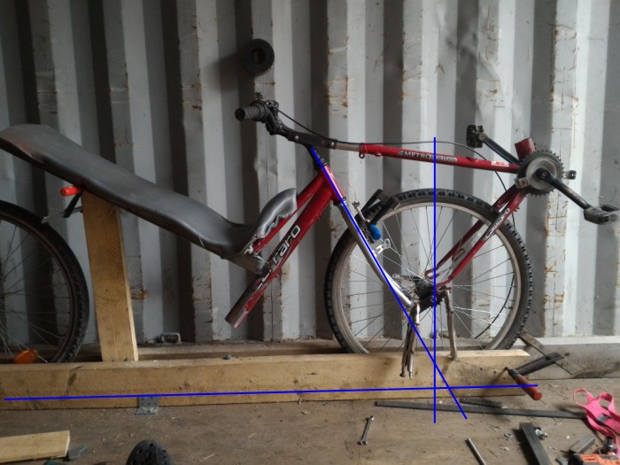 Siinähän se kyselemäni jättö ja muutkin tärkeet pisteet ja kulmat on. Aikalailla sama geometria ku tässä miun pyörässä. Miulla on rengas lähempänä penkkiä ja keskiö taitaa olla alempana.