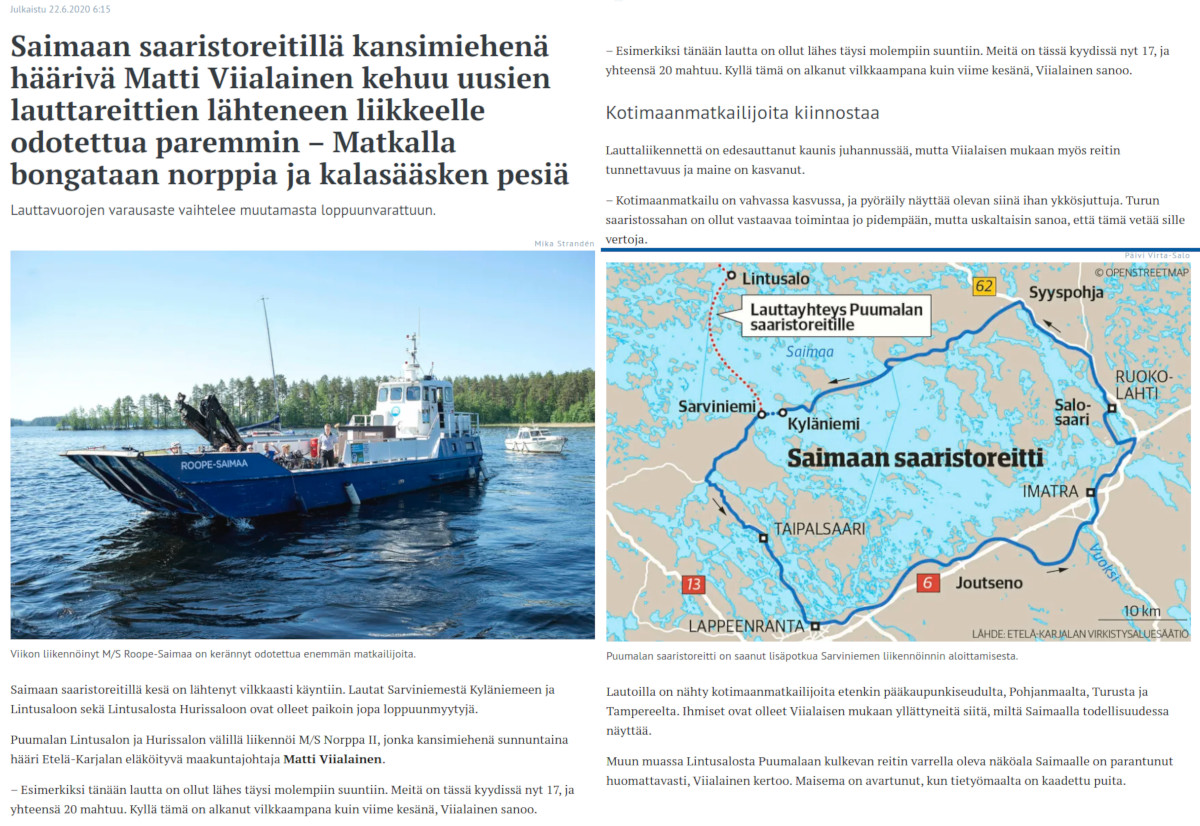Etelä-Saimaa lehdessä "mainos" Saimaan pyöräilyreiteistä.