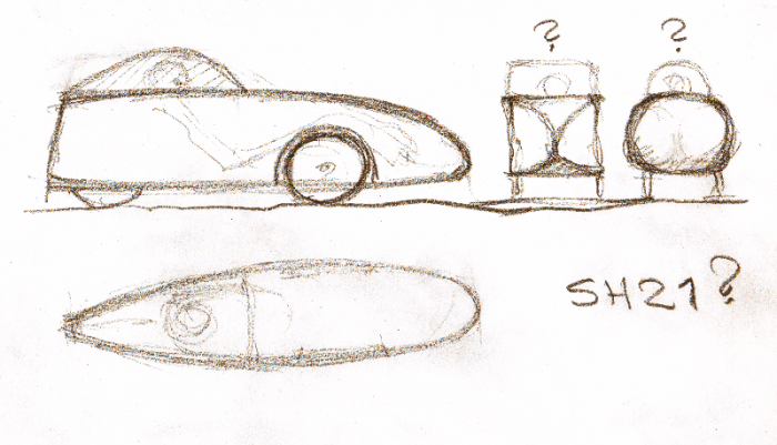Kun SH 20 alkaa olla maalausta vaille valmis, tein käteisvaraluonnoksen velomobiilistä, jossa on itsekantava ohutvanerikori.