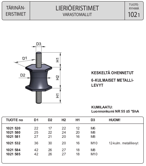 Pysäytin kumia en ehkä ekassa vaiheessa kokeilisi, mutta esim Trelleborgin HK60-40 tai HK60-50 eristin vaikuttaisi mielenkiintoiselta, jos sellaisen saa jotenkin kiinni rakenteeseen. Perusteena mm. sivuttaisjäykkyys.