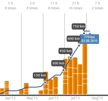 Olisi varmaan pitänyt aloittaa päiväkirja jo aiemmin, mutta lähteehän se näinkin. Ensi alkuun voi ihmetellä alla olevaa käppyrää. Ei liene vaikea päätellä, milloin minusta tuli nojakisti. Palkkien korkeus kertoo, montako tuntia pyörän päällä on viihdytty viikottain. Yläreunassa on tunnit kuukausitasolla. Sininen käyrä kertoo kumulatiiviset ajokilometrit.