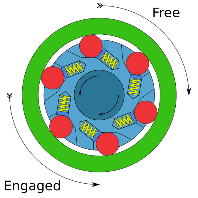 Rulla pääsee kulumisen takia tuossa kolossa loivan luiskan päähän asti, mutta ei kiristy riittävästi rummun sisäpinnan ja luiskan väliin. Kova polkaisu saa rullat luistamaan yhdeltä kohdalta, jolloin tämä kohta hieman luistaa, akseli taipuu hieman ja paine hellittää kiertosuunnassa seuraavalta rullalta, joka luistaa, joka taas taivuttaa akselia ja hellittää painetta taas 90 asteen päässä kiertosuuntaan. Tämä tuottaa siis rääkäisevän äänen, kun luisto, pito ja akselin taipuma kiertävät rumpua 90 asteen vaiheissa.