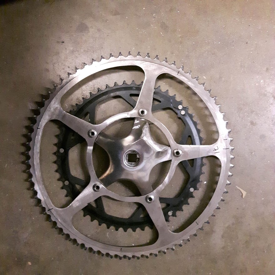Siirsin edestä taakse napamoottorilla varustetun 20" kiekon. Muuten homma toimisi, mutta välitys vaatisi suuremmat eturattaat. SH32:ta varten sain Härskiltä 71 ja 60 hampaiset rattaistot. Kun SH32 ei tarvinnut käytössäni olevaan keskiöosaan liittyvää kampea, minä onneton menin leikkaamaan sen pois. Nyt SH34:ää varten sen tarvitsisin. Olen eri paikoista yrittänyt sellaista kysyä, mutta eipä ole löytynyt. Keskiö on viisisakarainen ja pulttien etäisyys keskipisteestä 65 mm. Tarvitsisin siis vain kammella varustetun keskusosan. Olisikohan kellään sellaista rojujen seassa tai mistä sen voisi hankkia?