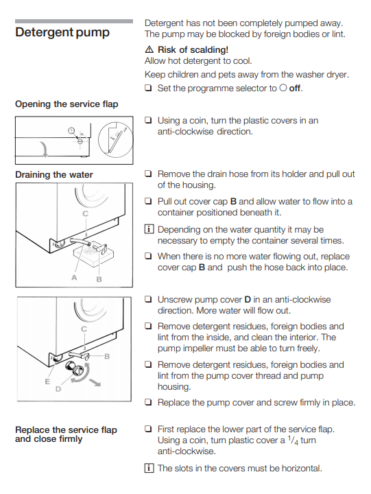 Tyhjennyspumppu pitää tarkistaa ensin. Lähtee auki vastapäivään kiertämällä.