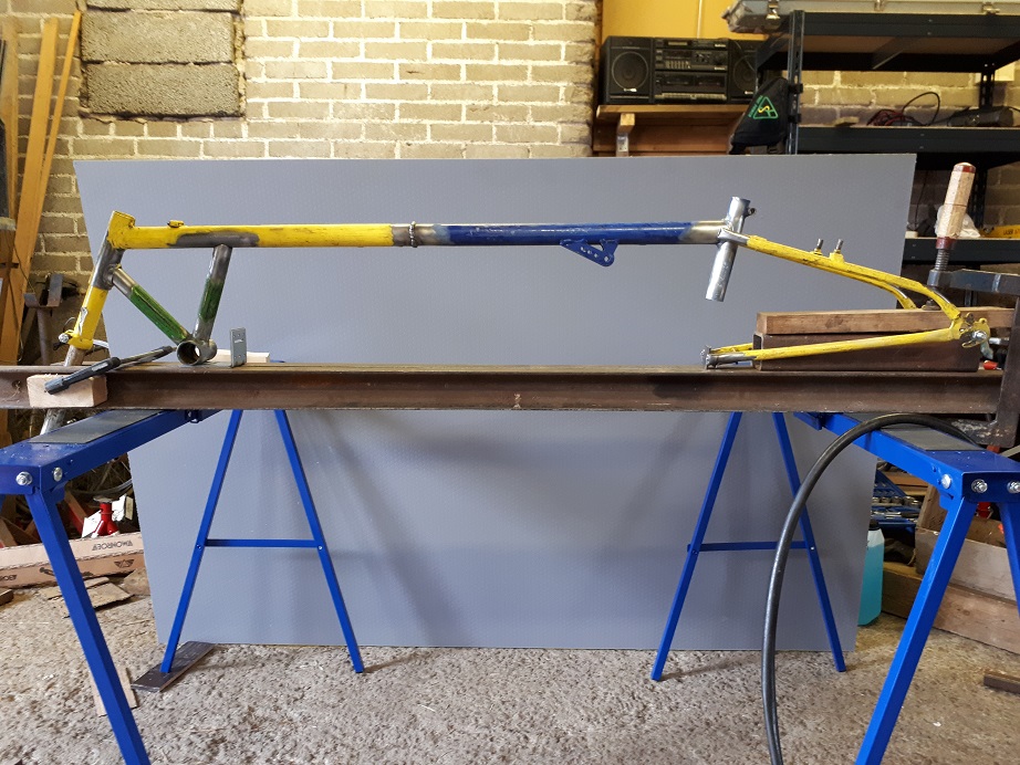 Onneksi on sentään mahdollista touhuta pajalla normaalisti koronasta huolimatta. Siispä vaimolle uuttaa pyörää tekemään. Ensin meinasin jos vanhaa kunnostaisi, mutta kun siinä on 20 v. vanhaa tekniikkaa, Fauberin keskiötä ym. Nurkkiin on kertynyt rungonpalasia, joista sai yhdisteltyä varsin tyypillisen pitkärunkoisen mallin. Rengaskoot 406/559. Ajattelin ensin tehdä ilman piirustuksia, mutta ei vaan osaa kun on niihin tottunut. Mitoitus hoituu kätevämmin Cadillä. Tein skissin jota yritin noudattaa, en nyt ihan orjallisesti. Tärkeintä on että runko on suora, siis kiekot ja keskiö linjassa. Tällä kertaa tein "jigin" pelkälle rungolle ilman kiekkoja.