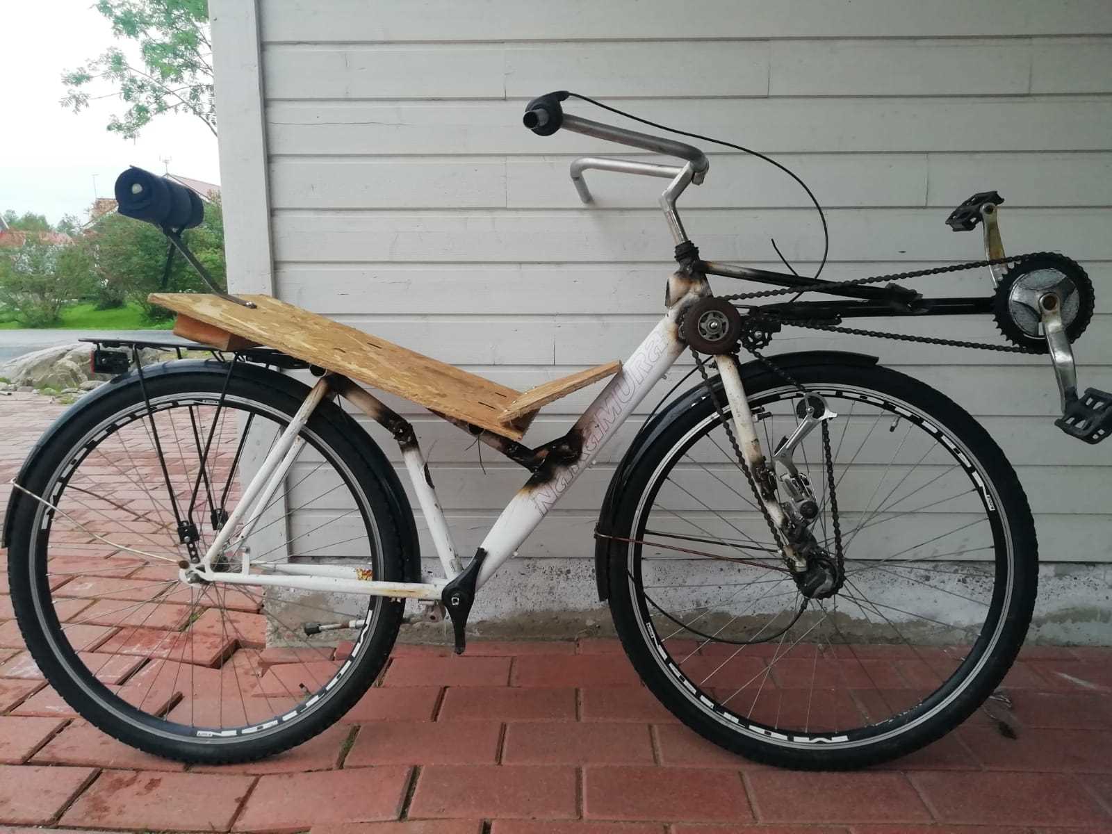 Pyörän paino oli jossain 27 kilon luokassa. Tällä on tarkoitus kokeilla työmatka-ajoa täältä Tupoksesta Ouluun 20 km/suunta tasaisia teitä pitkin.