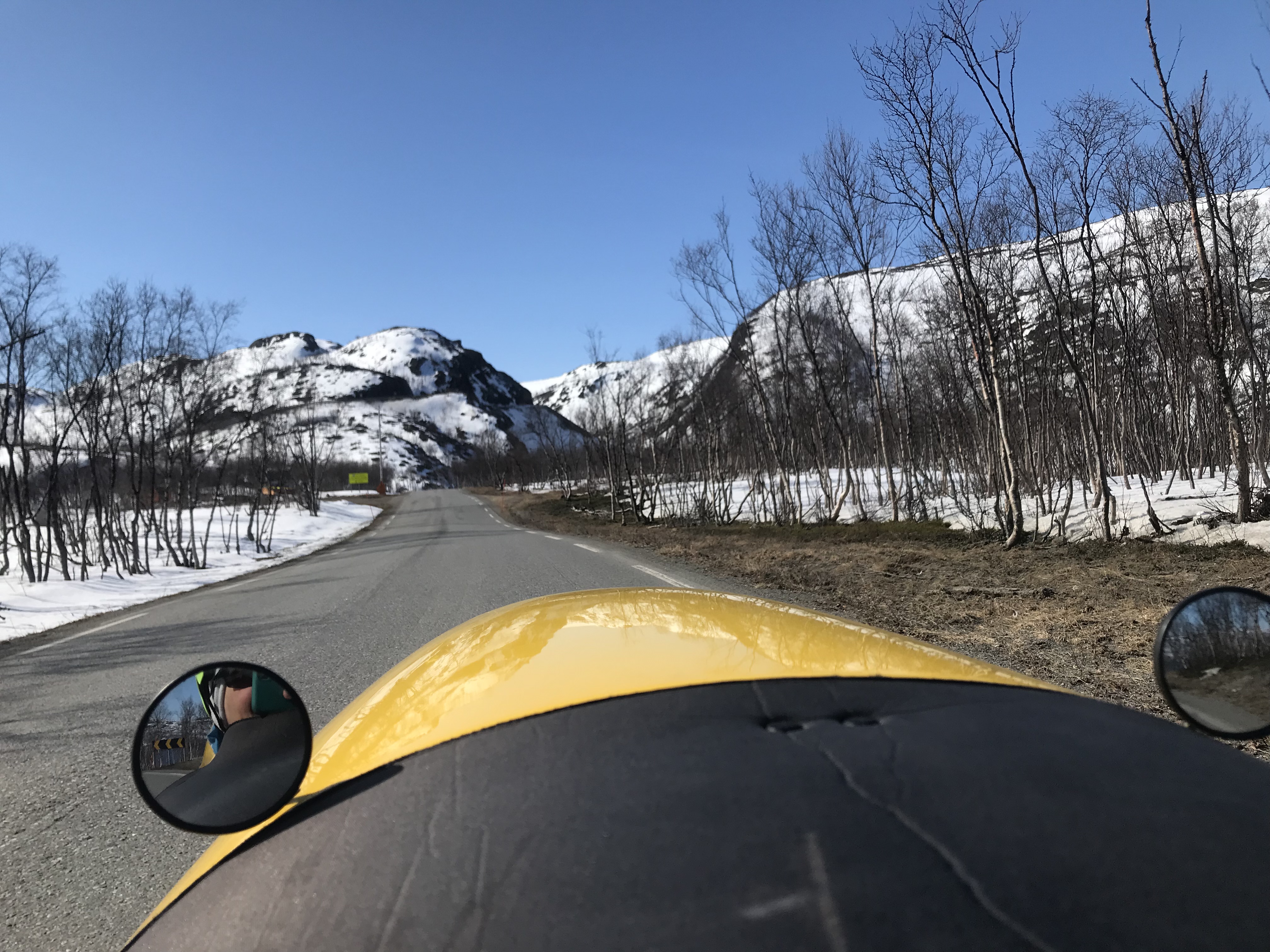 Ylhäällä on paljon pilkkijöitä. Norjalaiset käyvät Ifjordfjelletillä kuulemma vielä juhannuksenakin pilkillä. Tuuli on paikoitellen kinostanut tielle lunta, mutta kertaakaan en jää jumiin kesärenkaineni.
