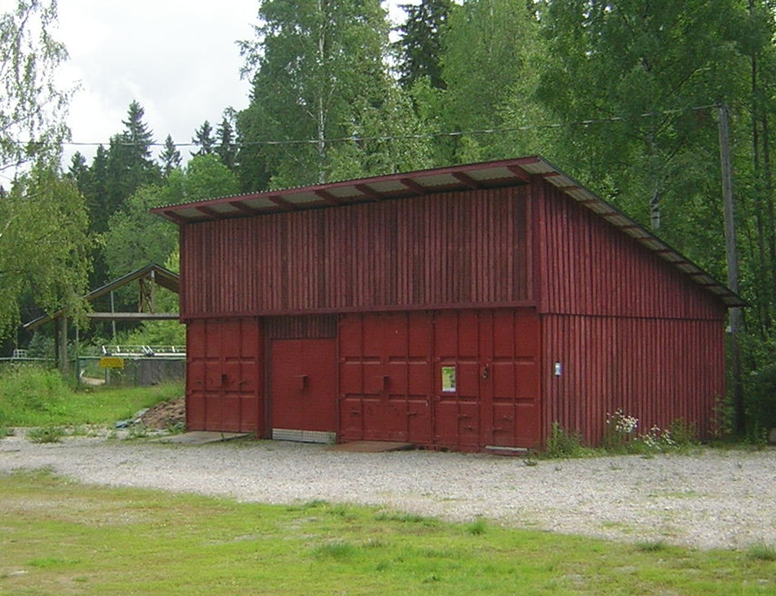 Tällainen pihavarasto on rakennettu Tampereen vinttikoiraradalle. Siinä on kolme 20 jalan konttia ja yksi kontin mittainen väli, jossa on maalattia (erilaiset ovet). Tuosta välitilasta pääsee myös kiipeämään konttien katolle, jonne siis jäi hyvin tuulettuva ullakko. Konttiryhmä on sitten katettu yhteisellä pulpettikatolla. Idea lienee ollut, että kattokulma on niin jyrkkä, ettei tarvitse ottaa lumikuormaa huomioon, kun lumi putoaa itsekseen peltiprofiilikatolta. Tuolla keinoin on katon ruoteina voinut käyttää 6" suhteellisen ohutta lankkua. Katto on pulpettityyppinen, jotta lunta ei katolta kerry oven eteen. Ylen käytännöllistä siis. Siksi tuo muoto on hieman erikoinen. Ihan siedettävän näköinen silti minun mielestäni. Kuvan taka-alalla näkyy myöskin minimalistista rakennesuunnittelua edustava starttipaikan kate.