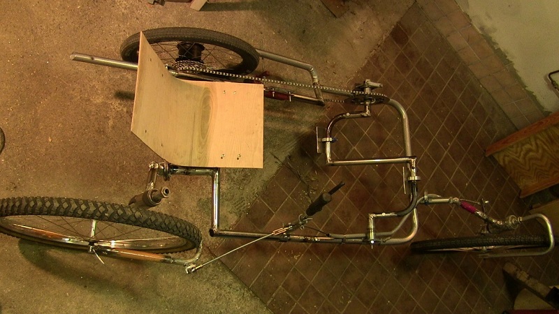 Etupyörän ohjaus toimii 6mm jäykällä rst. vaijerilla. Jäi joskus tähteeksi kun purjeveneen rakentaminen oli ajankohtaista. Penkki on 4mm vaneria 12mm neliöputken päälle muutamalla 5mm ruuvilla. Vetopyörän napa on sähköistetty. Saa nähdä sitten? Polkimien lätkät alumiinista turkkilevyä klemmarilla laakerin päälle, kääntyy aina inhottavasti alaspäin. Kammet on pätkistä, joten niiden muokkaaminen on pikkuhomma kunhan nyt pääsee kokeilemaan. Saa nähdä montako raitaa jää kunhan tulee ensilumi