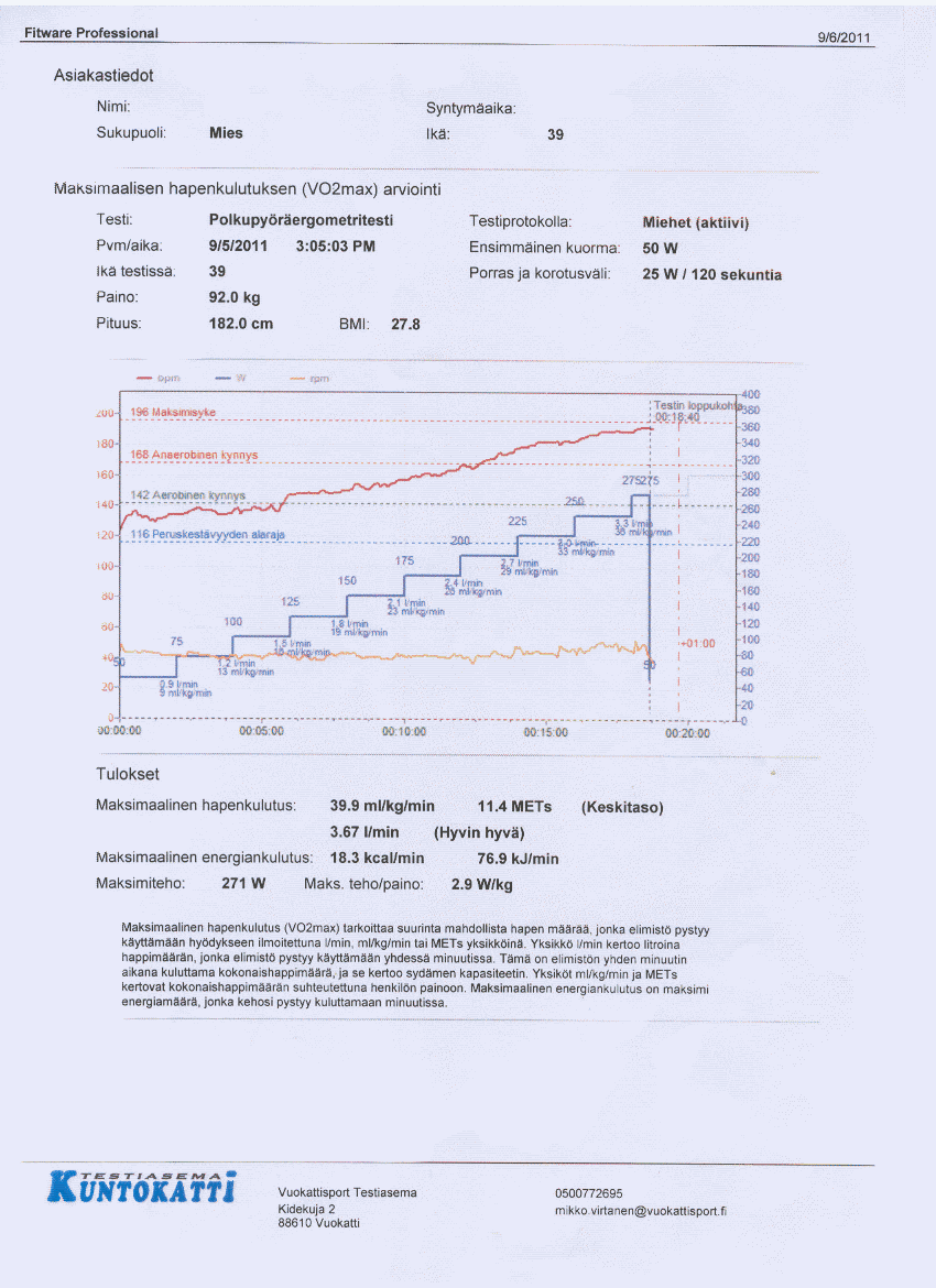 Pääsin työnantajan järjestämällä kuntokurssilla polkemaan kuntopyörällä maksimaalista hapenkulutusta arvioivan testin. Tulos liitteenä. Kertooko tuo pyöräilyn harrastajalle muuta kuin sen, että kykenen tuottamaan 270W tehon ja hapenkulutus kykyni on ihan ok, jos sitä ei suhteuteta painoon?
