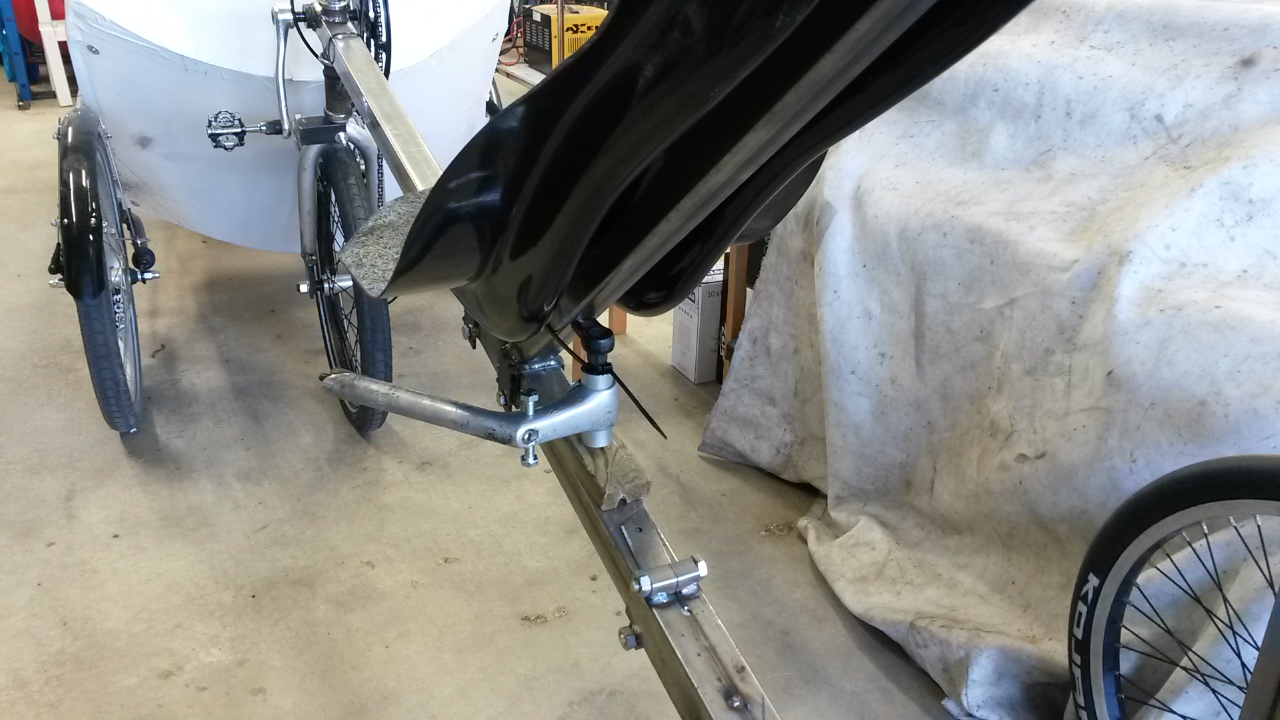Alaohjaus väliaikaisilla ohjaustangolla ja puisella raidetangolla. Pyörän ajettavuus parani ihan dramaattisesti verrattuna pitkään tilleriin. Nyt ohjaus puoltaa tien kaltevuuden suuntaan, kuten pitääkin. Enää ei pelota mutkiin ajelu. Yllättävän paljon tuli kettwieselin oloinen ajotunnelma.