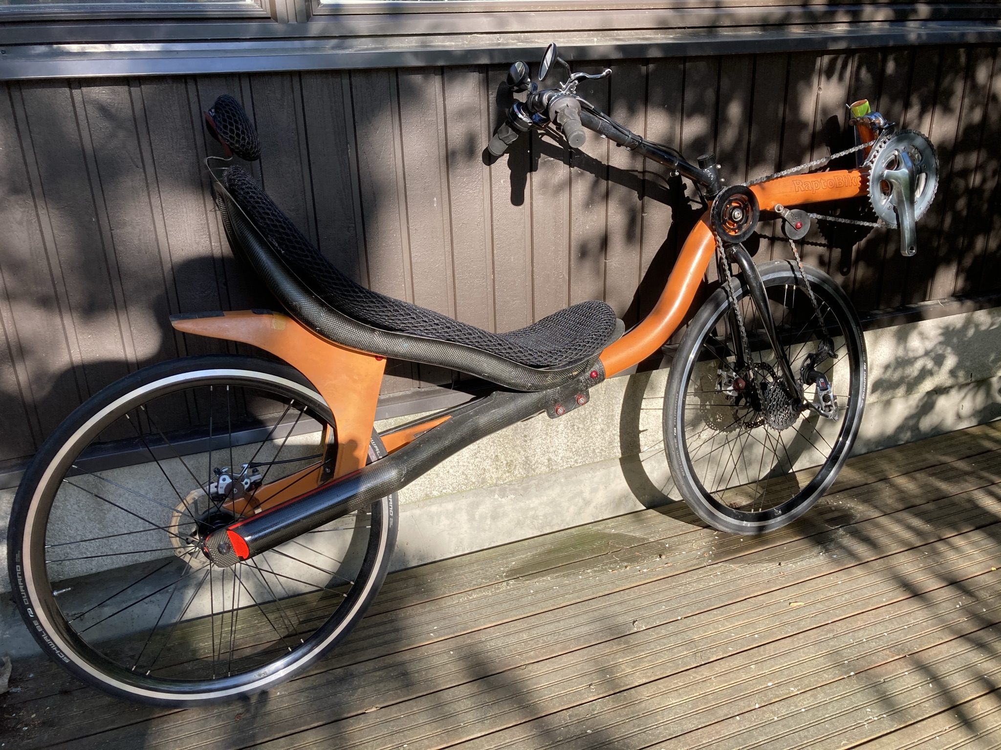 Front half chromoly steel, rear half carbon fibre runko made by Australian, Pete Heal (PoiterH on BentriderOnline. Ostin pyörän häneltä)