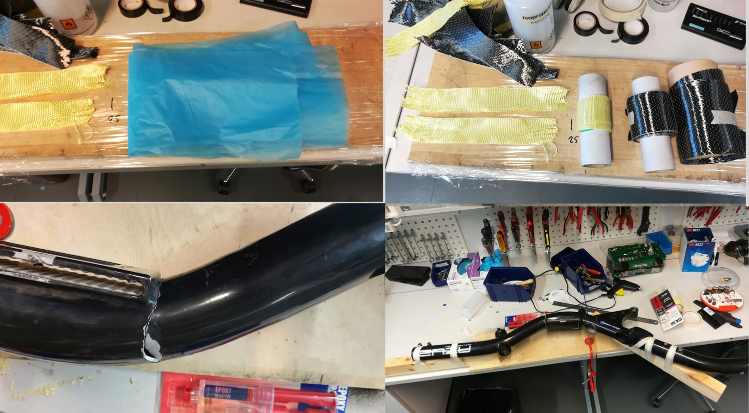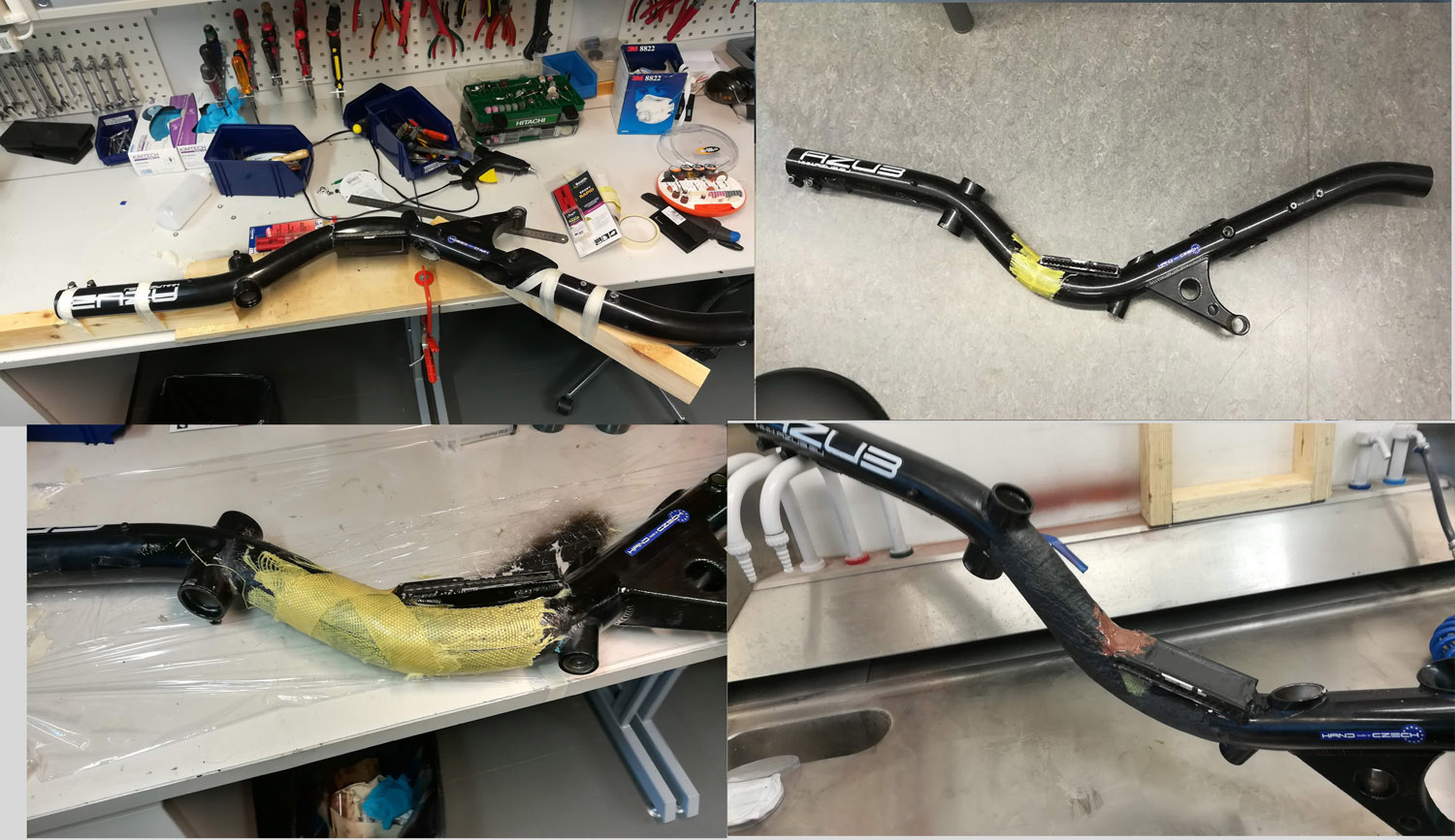 Aluksi rakentelin jigin, jossa sain rungon katkenneiden osien päät aseteltua siististi yhteen. Laminoinnissa epoksina Ampreg 21, kuituna 50 ja 100 mm UD-hiilikuitua ja 50 mm kevlar-nauhaa.
