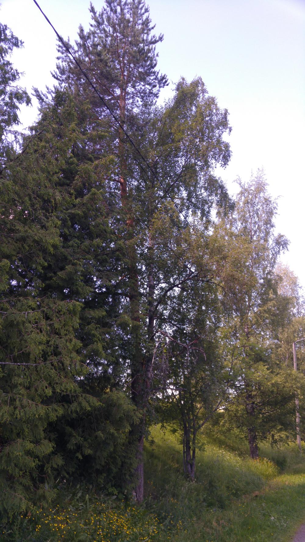 Kesän (ja edelliskesän polvivamman jälkeen) ensimmäiseltä lenkiltä (pystypyörällä, trikeä ei ole vielä muutettu) löytyi uudelta asuinpaikalta (Viiala, Akaa) jännittävä vuosikymmenien painiottelu. Ketterä mänty on parikymmentä vuotta sitten tehnyt alistetusta asemastaan onnistuneen heiton ja päässyt valon puolelle, mutta sitkeä koivu ei ole hellittänyt vaan haroo kuristusotetta varjon puolelta kurottaen vielä leveämmälle. Seuraamme ottelua herkeämättä tulevina vuosikymmeninä...