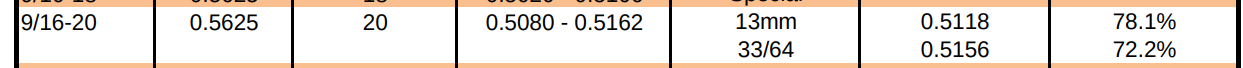 Nuo minun kierretapit ovat 9/16 20 TPI, porakoko lienee jotain 12,8 mm mutta kyllä 13 mm kai toimii... 20 TPI:lle ei oikein heti tarkkaa porakokoa löydy helpolla...