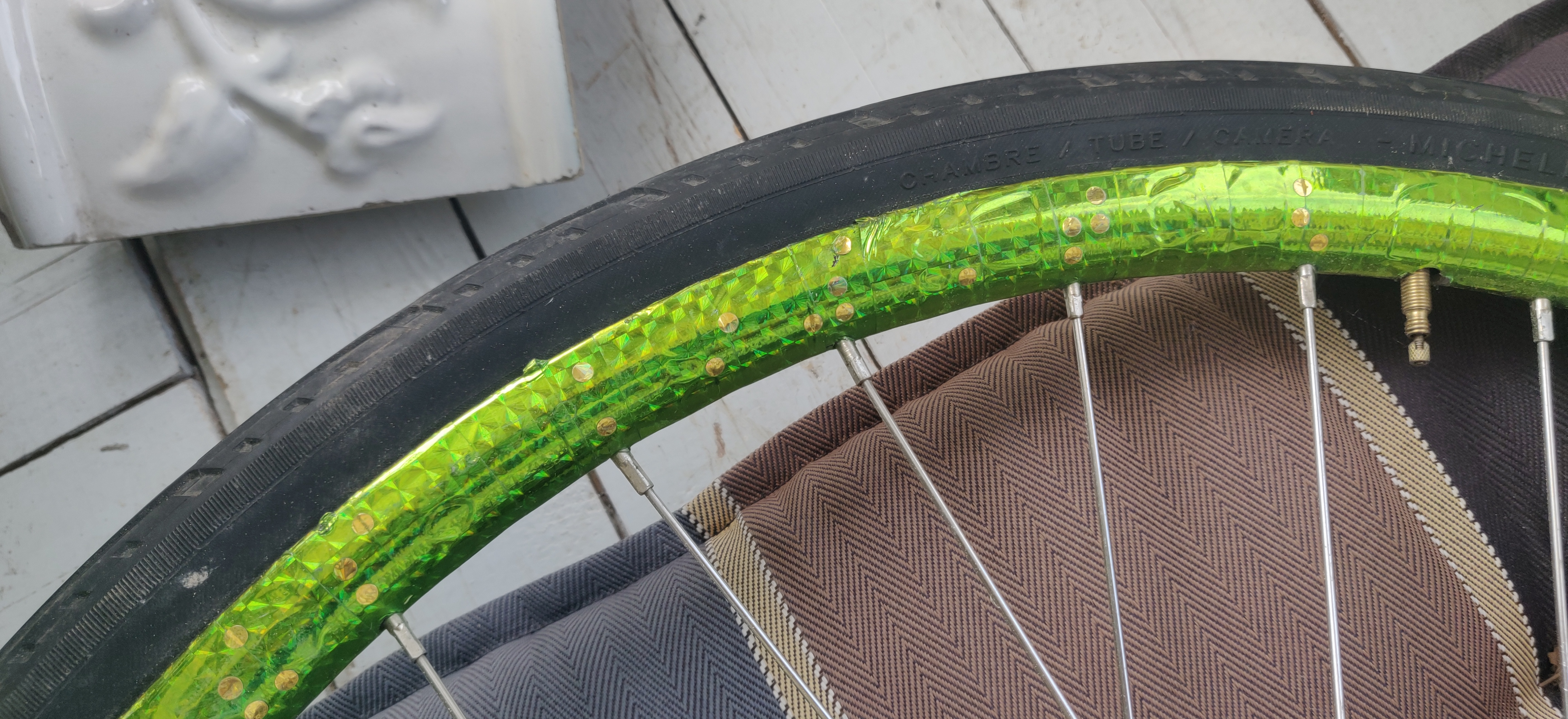 Sama pätee myös nojakkiini ja cyclocrossiini: rullasta riitti niihinkin vaikka kuinka hyvin sitä 20 mm leveää valkoista heijastinteippiä. En ole viitsinyt repiä sitä pois nyt kesäajaksi, koska sen silmiä hivelevä heijastus ei näin valoisana kesäaikana häiritse ketään. Ja eipä ole viime vuosina ajettu autoilla päälleni vasemmalta kärkikolmion takaa...