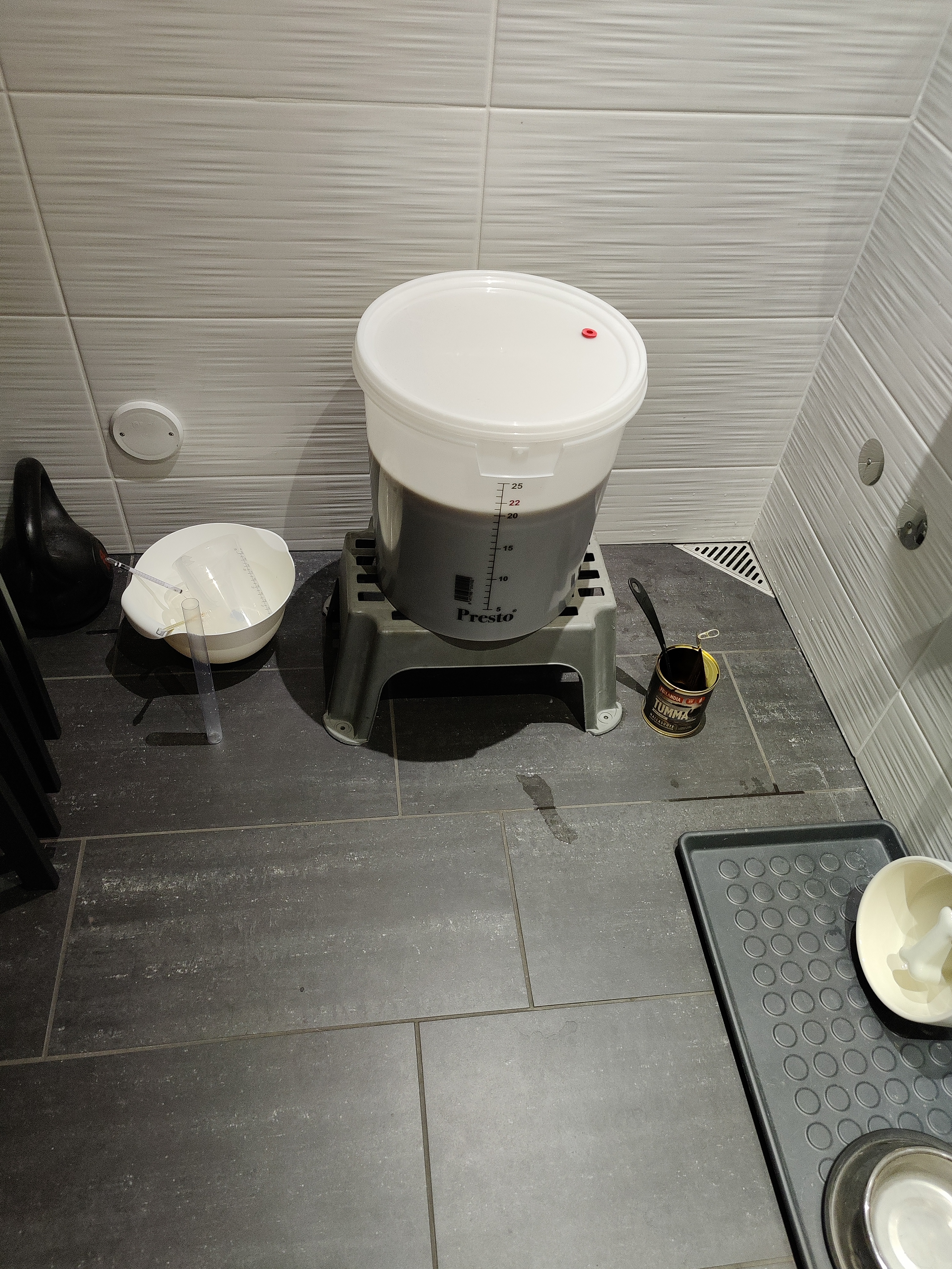 Näkyy tuossa kuvassa olevan myös desinfiointiainetta. Hyvä. Mutta epäilen, että ne ovat myyneet sinulle kvattia eli kvaternäärisiin ammoniumyhdisteisiin perustuvaa desinfiointiainetta. Hyvää se on. Mutta itse olisin käynyt ostamassa apteekista 10 %:sta Betadinea, josta laimentamalla saa tehtyä 1 %:sta liuosta. Sitä kun laittaa 10-15 ml litraan vettä, saa desinfiointiliuosta, jossa on jodia 100 -150 mg/l. 15 minuuttia sitä tekee selvää puhtaaksi pestyssä astioissa olevista mikrobeista, eikä liuosta edes tarvitse huuhtoa pois - riittää, että sen vaan kaataa veke ja valuttaa viimeiset pisaratkin pois. Jodi noin pieninä määrinä ei ole vaarallista ja sitäpaitsi, ihminen tarvitseekin pienen määrän jodia...