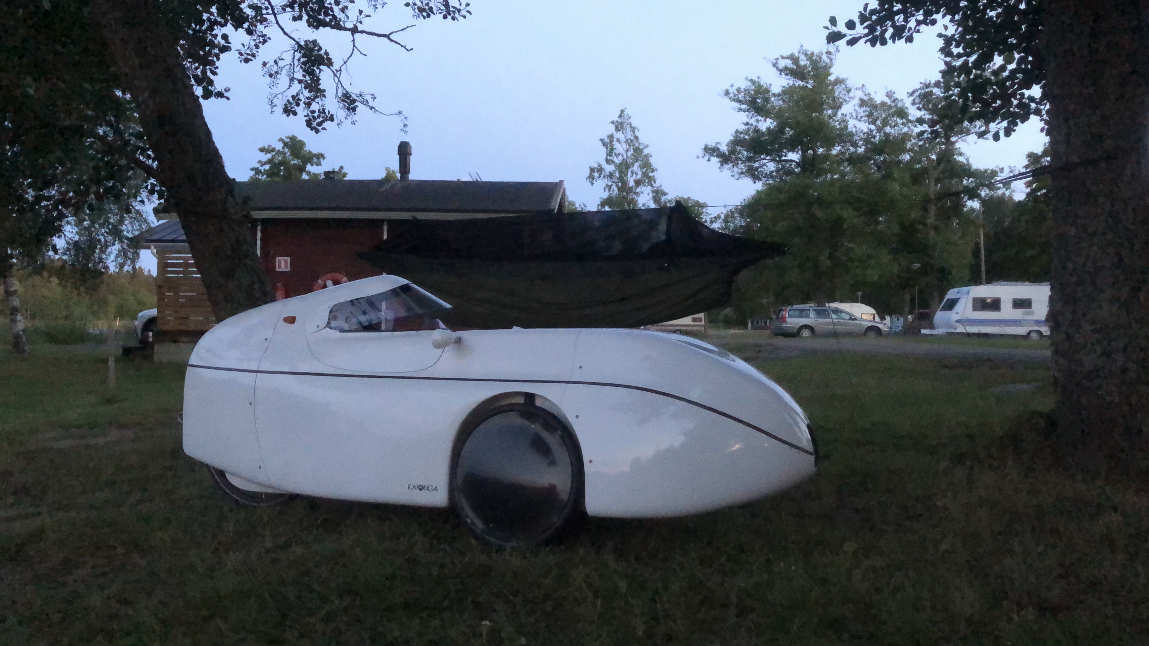 Velomobiilin säilytyksen kannalta on monella tapaa helpointa leiriytyä. Akkujen lataus ei helposti onnistu puskassa joten leirintäalue kutsui jälleen.