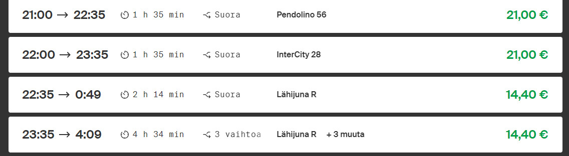 Edit: Näköjään tuolla klo 21 junalla jää vaihtoaikaa Tikkurilan asemalla 4 minuuttia viimeiseen bussiin kotiin, JOS ne ovat aikataulussa. Sen jälkeen kotiin pääsy edellyttää taksia tai useamman julkisen välineen käyttöä.