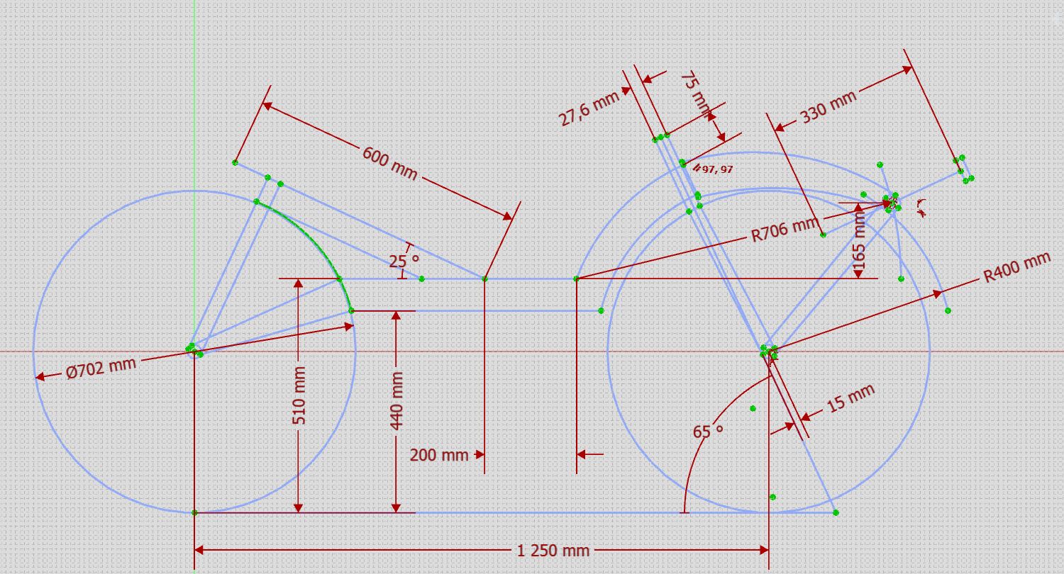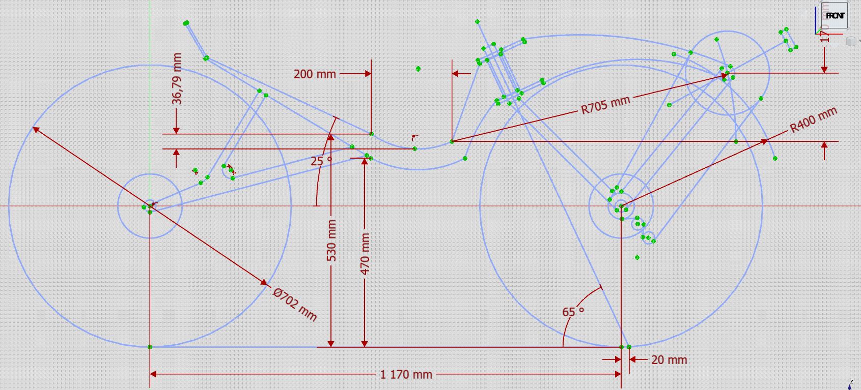 Tällä hetkellä BB on reilun 400mm päässä keskiöstä, rungon noususta kampikeskiöön muutama milli vähemmän kuin inseam. Mitoituksen perustana sama kuin pystärissä ja x-seam mitta aika tarkalleen senttiä vaille.