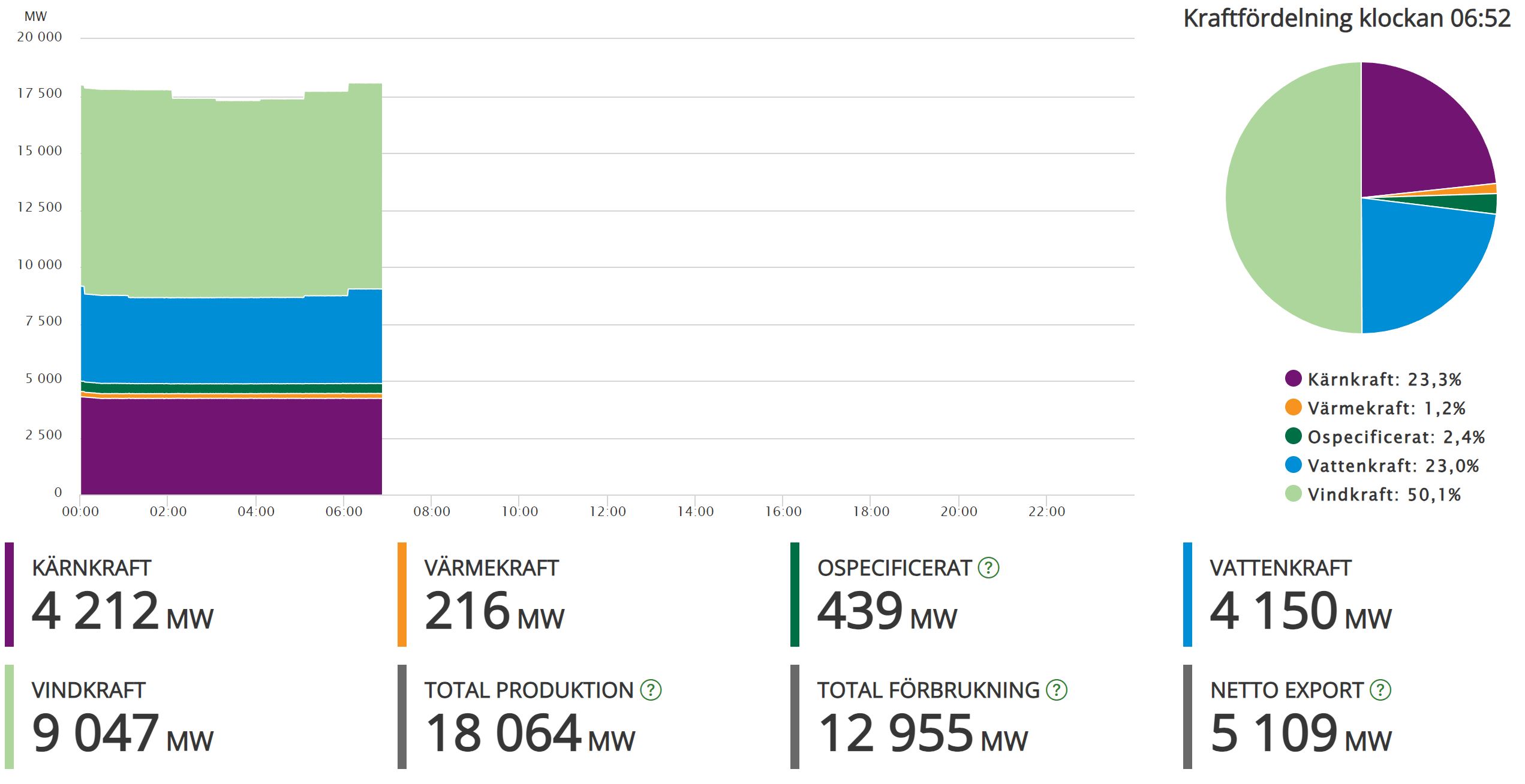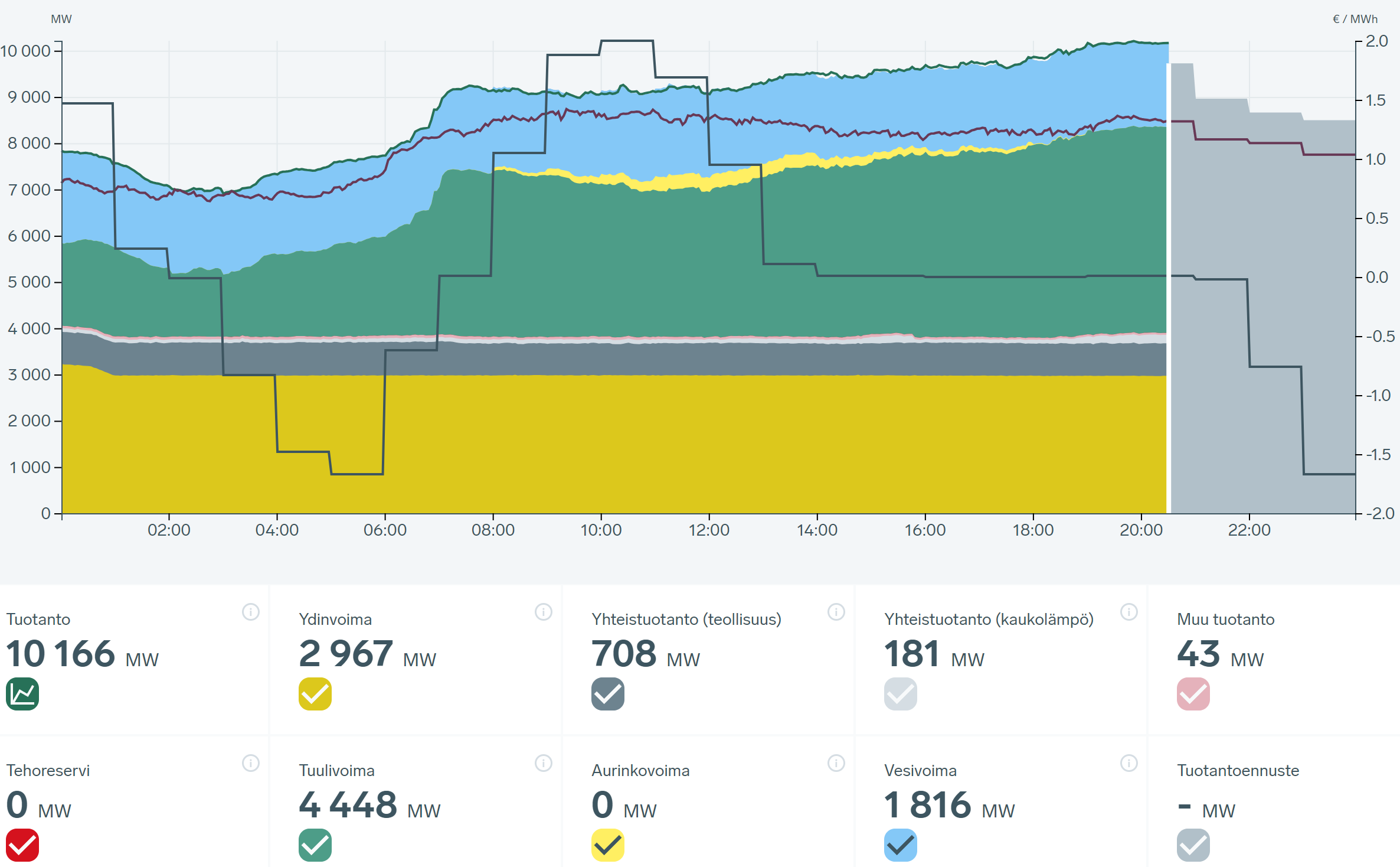 Tällä hetkellä työntää tuulivoima verkkoon 4500 MW. Toiseksi suurin tuottaja on ydinvoima, jota tulee vajaat 3000 MW. Kulutus on 8500 MW, joten tuulivoima tuottaa yli puolet kulutuksesta. Kokonaistuotantoa on reilut 10200 MW, joten Suomesta viedään ulkomaille 1700 MW. Suomessa sähkön hinta on nolla, Virossa 36,6 c€/kWh.